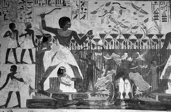 While much royal tomb decoration served funereal purposes, it was also common to include paintings that depicted activities from daily life. In this scene, the nobleman hunts in the Nile marshes with his family. Birds fly above and fish swim below the reed boat that carries the nobleman and his family. Crops are being harvested. The scene is one of abundance, a celebration of life as experienced by a noble and his family.