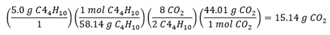 Objective 007 Response C is correct because to properly solve this problem, the following information is needed: balanced combustion equation, molar mass of C 4 H 10 , and molar mass of C O 2 . Unbalanced equation: C 4 H 10 plus O 2 yields C O 2 plus H 2 O First balance C and H: C 4 H 10 plus O 2 yields 4 C O 2 plus 5 H 2 O Then balance O using a coefficient for O2 on the left side: C 4 H 10 plus 13 halves O 2 yields 4 C O 2 plus 5 H 2 O Finally, multiply all coefficients by 2 to remove the fraction: 2 C 4 H 10 plus 13 O 2 yields 8 C O 2 plus 10 H 2 O This balanced equation gives you the C O 2 to C 4 H 10 mole ratio (8 to 2) needed to calculate quantity of C O 2 produced. Calculating molar mass of C 4 H 10 : Molar mass C 4 H 10 equals 4 times MM C plus 10 times MM H equals 4 times 12.01 plus 10 times 1.01 equals 58.14 grams/mol C 4 H 10 Calculating molar mass of C O 2 : Molar Mass C O 2 equals MM C plus 2 times MM O equals 12.01 plus 2 times 16.00 equals 44.01 grams/mol C O 2 Finally, use dimensional analysis to calculate mass of C O 2 produced from 5.0 g C 4 H 10 : 5 point 0 grams C 4 H 10 times 1 mole C 4 H 10 per 58 point 1 4 grams C 4 H 10 times 8 C O 2 per 2 C 4 H 10 times 44 point 0 1 grams C O 2 per 1 mole C O 2 equals 15 point 1 4 grams C O 2 It is possible to do the same calculations after first rounding molar masses to nearest gram and get a result that matches the correct answer. Response A is incorrect because it comes from a calculating error that incorporates a factor of 10 in the denominator (such as dividing by 581.4 instead of 58.14) or a factor of 0.1 in the numerator (such as multiplying by 0.50 instead of 5.0). Response B is incorrect because it fails to correct for C O 2 to C 4 H 10 mole ratio (8 to 2). Response D is incorrect because it fails to correct for C O 2 to C 4 H 10 mole ratio (8 to 2), and it incorporates a calculating error that incorporates a factor of 10 in the numerator (such as multiplying by 50 instead of 5.0) or a factor of 0.1 in the denominator (such as dividing by 5.814 instead of 58.14). |